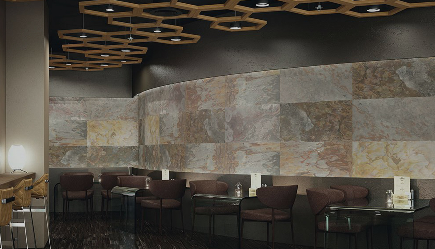 Този уникален каменен фурнир има безкрайни възможности за приложение. Полупрозрачният вариант може да се използва за нестандартно осветяване на пространството.
